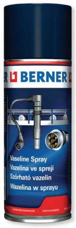 Wazelina w sprayu firmy Berner to uniwersalny środek smarujący. Idealny do zastosowania na zaciskach akumulatora, szprychach, zamkach, częściach gumowych, na częściach chromowanych i wielu innych. Do zastosowań profesjonalnych.
