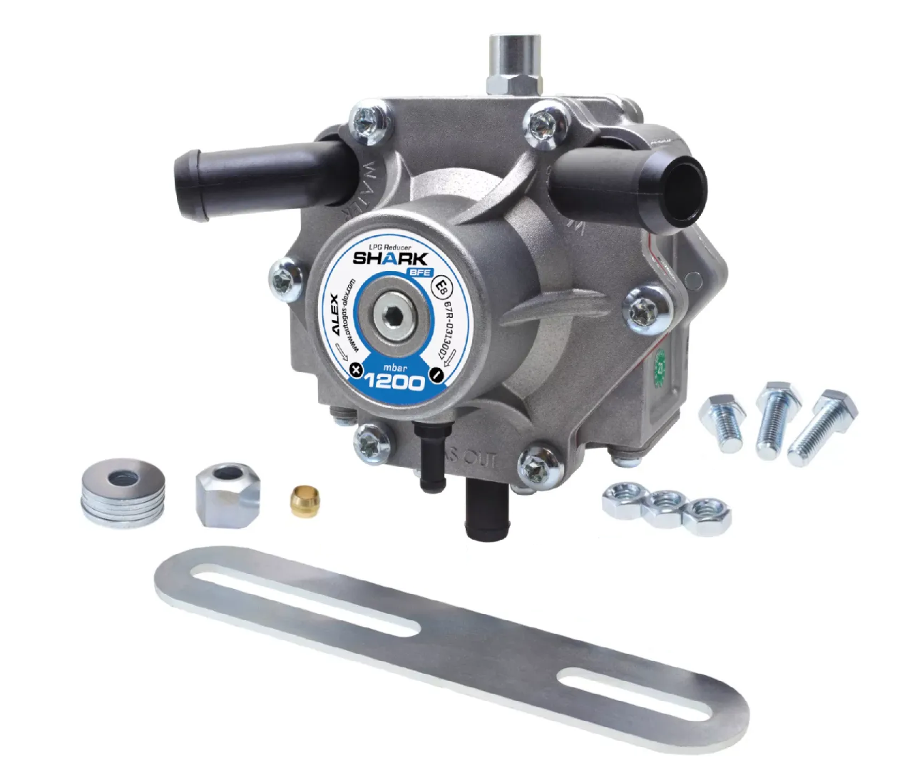Alex Shark BFE 1200 150 hp reducer. The modern design of the evaporator ensures proper functioning in harsh weather conditions, which translates into trouble-free operation of the gas system in the car. Reducer without integrated gas valve, diaphragm design ensures full efficiency and no pressure drop over the full load range and allows for two-plane mounting.